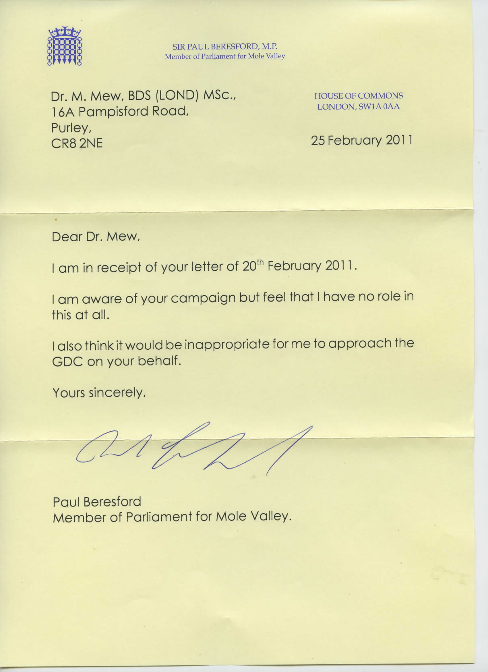 2011/02/25 Ltr from Paul Beresford MP of GOV